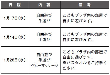 赤ちゃん広場の対象家庭の方もわんぱく広場に記載している1月15日(木)「防災座談会」、21日(水)「親子運動遊び」、29日(木)「豆まき会」にも参加できます。