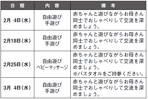 乳児(1歳6か月未満)を持つ親子が安心して遊べ、お母さん同士が子育てについて気軽におしゃべりできる広場です。