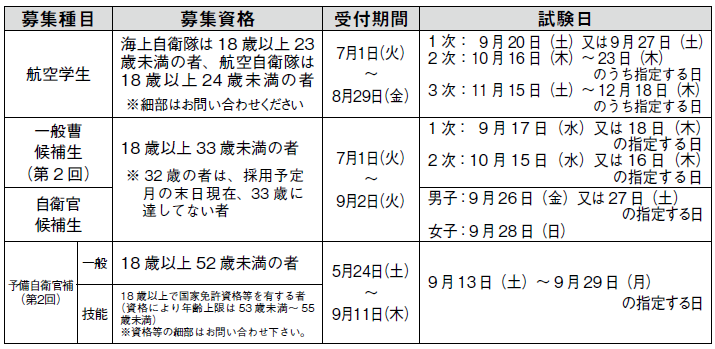 ◇航空学生、一般曹候補生、自衛官候補生、予備自衛官補についてお知らせします。