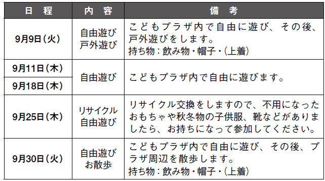 ※室内遊びの予定の日でも、戸外で遊べるよう水筒・帽子・ジャンパー等の用意をお願いします。