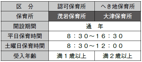 新規入所希望児童:申込書類は茂岩保育所、大津支所にあります。また役場ホームページからもダウンロードできます。
