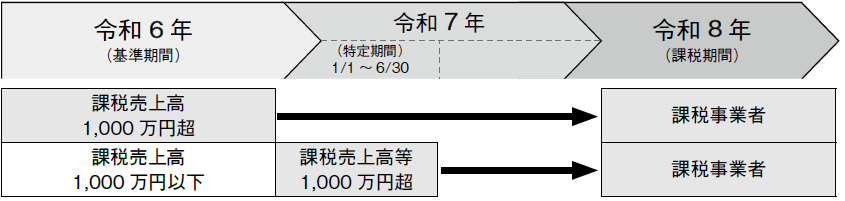 ※令和6年分(基準期間)の課税売上高が1,000万円以下であっても、令和7年1月1日から令和7年6月30日までの期間(特定期間)の課税売上高が1,000万円を超えている場合には、令和8年分は消費税の課税事業者に該当します。この場合、納税地の所轄税務署長に「消費税課税事業者届出書(特定期間用)」を提出する必要があります。