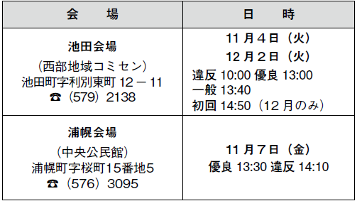 ・「一般」または「初回」を受講される方は、池田会場等で受講してください。