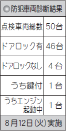 また、その期間中に防犯車両診断を実施しておりますので、町民皆様の自己防犯意識向上を図るため、結果について公表いたします。
