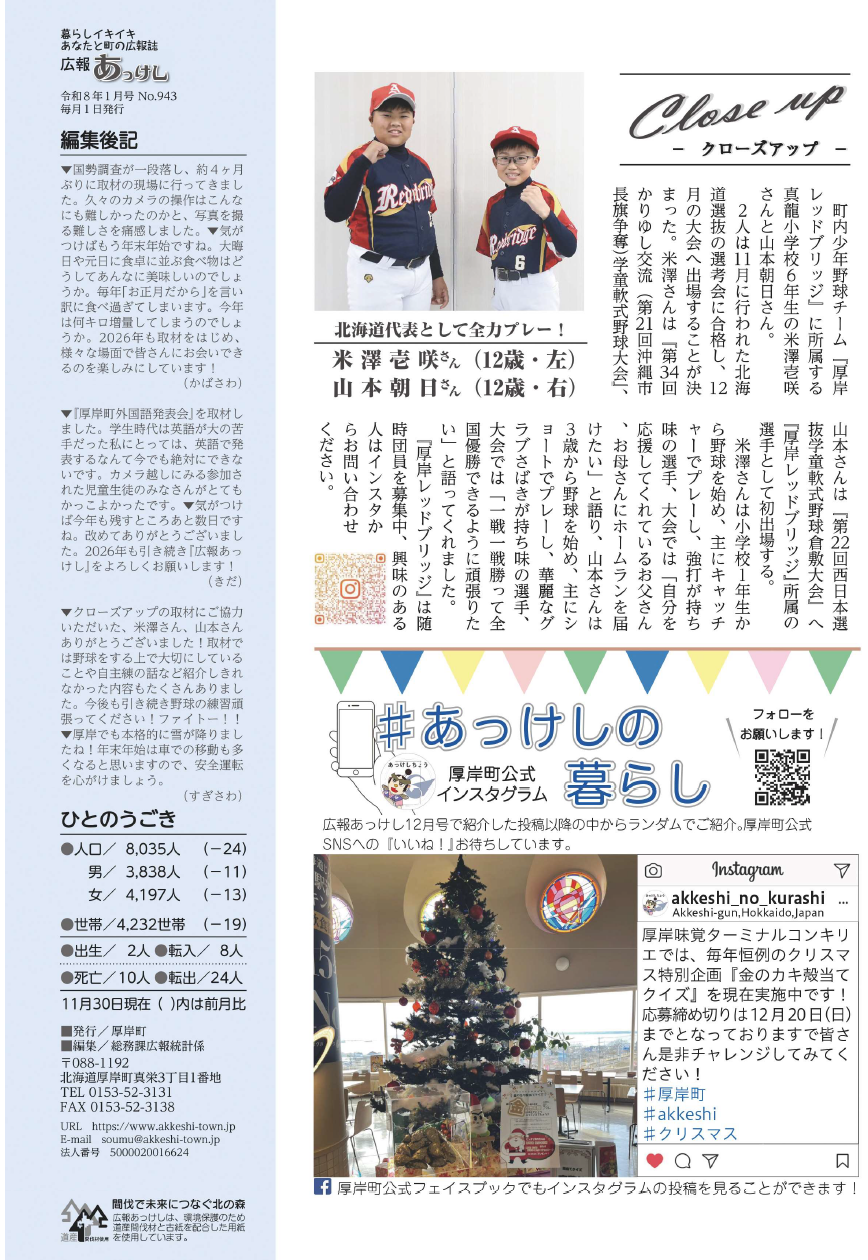 その他 広報あっけし 令和8年1月号 裏表紙 18/18 前の記事 発行日 : 2026年01月01日 自治体名 : 北海道厚岸町 広報紙名 : 広報あっけし 令和8年1月号 Tweet シェアする 広報あっけし 令和8年1月号 P.19