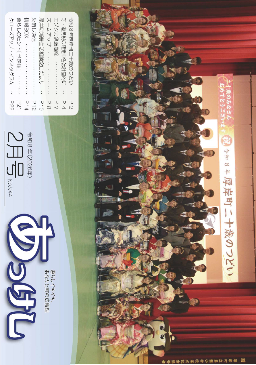 その他 広報あっけし 令和8年2月号 表紙 1/20 次の記事 発行日 : 2026年02月01日 自治体名 : 北海道厚岸町 広報紙名 : 広報あっけし 令和8年2月号 Tweet シェアする 広報あっけし 令和8年2月号 P.2-3