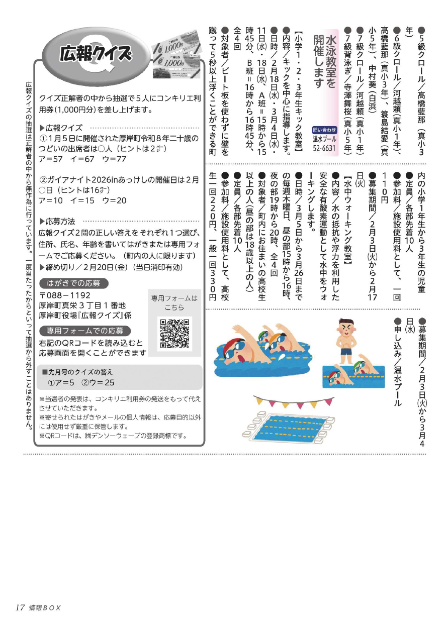 その他 広報あっけし 令和8年2月号 P.17 15/20 前の記事 次の記事 発行日 : 2026年02月01日 自治体名 : 北海道厚岸町 広報紙名 : 広報あっけし 令和8年2月号 Tweet シェアする 広報あっけし 令和8年2月号 P.16 広報あっけし 令和8年2月号 P.18