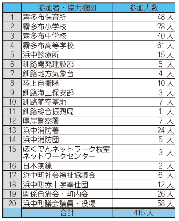11月10日、災害対応力の強化を目的とする浜中町防災総合訓練を実施し、防災関係者を含む415人が参加しました。