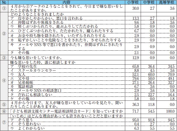 この結果に基づき、各校においては児童生徒一人ひとりと教育相談を行い、いじめ根絶に向けた取り組みの充実を図るようにしています。