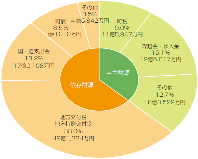 本年度は、自主財源が47億5,163万円(36.8%)、依存財源が81億7,344万円(63.2%)となっており、国・道への依存の割合が多い状況です。
