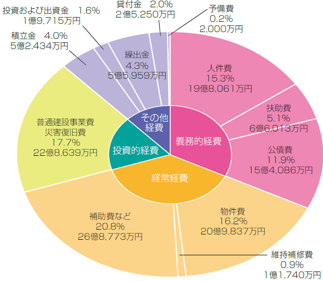 歳出予算は、目的別に分けられ各事業を行っており、義務的経費(公債費など)と経常経費(光熱水費など)、投資的経費(建設事業など)で構成されています。
