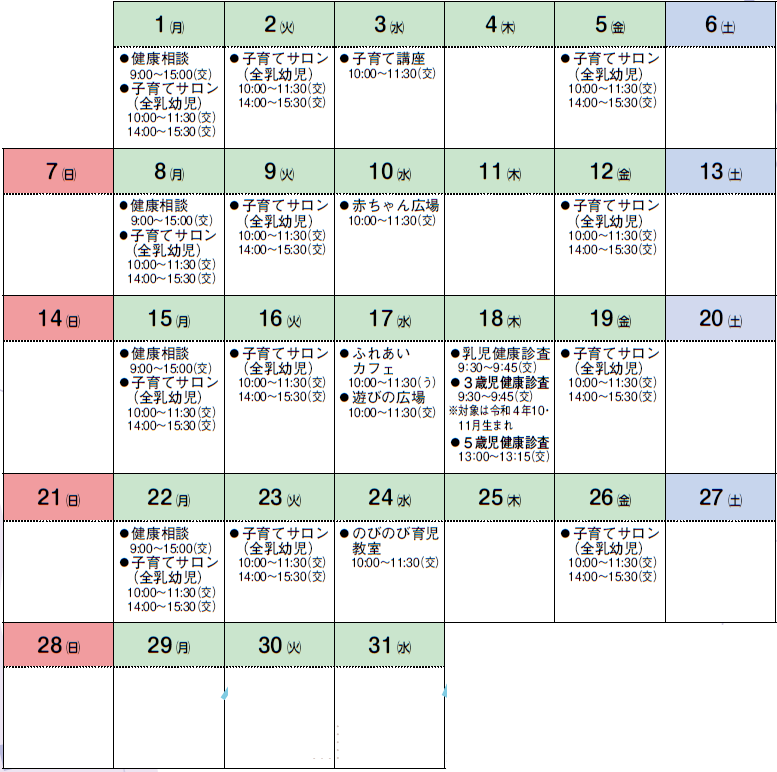 ・5日(月)…子育てサロン(全乳幼児)、健康相談