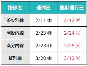 祝日により、お昼の便を運行できない場合、下記のとおり臨時運行します。