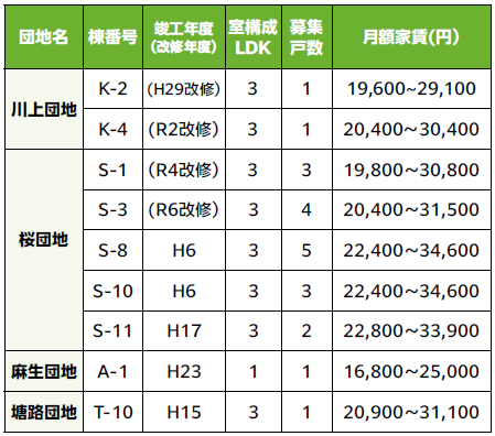 9月10日現在、退去届が出されている住宅です。入居日については、修繕などにより遅くなる住宅もありますのでご了承ください。なお、持ち家がある方、滞納している方、所得が一定以上ある方は申し込みできません。