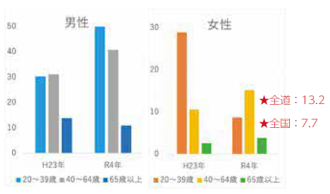 健康は毎日の生活を支える大切な土台です。しかし喫煙は、その土台を揺るがすリスクとなります。本町の喫煙率は20~39歳の男性で30.3%から50.0%と大幅に増えていることがわかりました。女性では若年層の喫煙率は減少したものの、40歳以上では増加傾向と全国・全道平均を上回る結果でした。