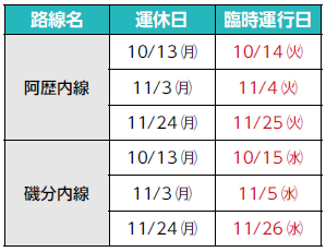 町有バスの昼の便は、週1回、各路線ごとを固定の曜日に運行しています。運行日が祝日にあたる場合は、昼の便を別の日に臨時運行します。