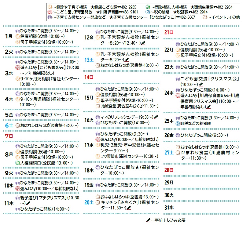 くらし 12月の予定 39/42 前の記事 次の記事 発行日 : 2025年12月01日 自治体名 : 北海道弟子屈町 広報紙名 : 広報てしかが 2025年12月号 ひなたぼっこ開放: 水~金曜日、全日午後…年齢制限なし 毎週月曜午前…0~1歳児 毎週火曜午前…1~3歳児 ※★が付く日は移動開放日(午前) Tweet シェアする 人のうごき【令和7年10月末現在】 12月の町税などの納期限
