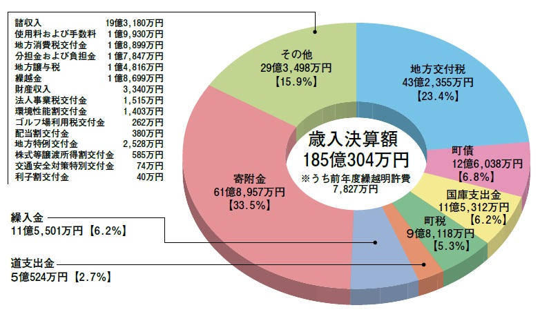 町の歳入(収入)は、皆さんに納めていただく税金や、使用料・手数料など町独自の収入「自主財源」と、地方交付税など国や北海道から配分される収入「依存財源」、町債(町の借金)などで成り立っています。