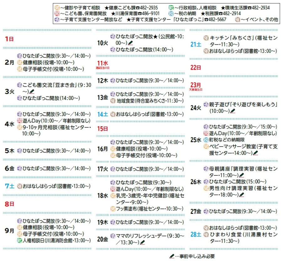 くらし 2月の予定 35/38 前の記事 次の記事 発行日 : 2026年02月01日 自治体名 : 北海道弟子屈町 広報紙名 : 広報てしかが 2026年2月号 ひなたぼっこ開放: 水~金曜日、全日午後…年齢制限なし 毎週月曜午前…0~1歳児 毎週火曜午前…1~3歳児 ※★が付く日は移動開放日(午前) Tweet シェアする 人のうごき【令和7年12月末現在】 2月の町税などの納期限