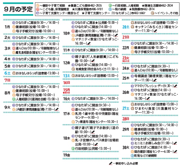 くらし 9月の予定 37/40 前の記事 次の記事 発行日 : 2025年09月01日 自治体名 : 北海道弟子屈町 広報紙名 : 広報てしかが 2025年9月号 ひなたぼっこ開放: 水~金曜日、全日午後…年齢制限なし 毎週月曜午前…0~1歳児 毎週火曜午前…1~3歳児 ※★が付く日は移動開放日(午前) Tweet シェアする 人のうごき【令和7年7月末現在】 9月の町税などの納期限