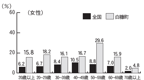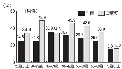町民アンケート調査によると、習慣的に喫煙している町民の割合は男性が34.4%、女性が15.8%で、男女どちらも全国の割合を上回っている状況にあります。