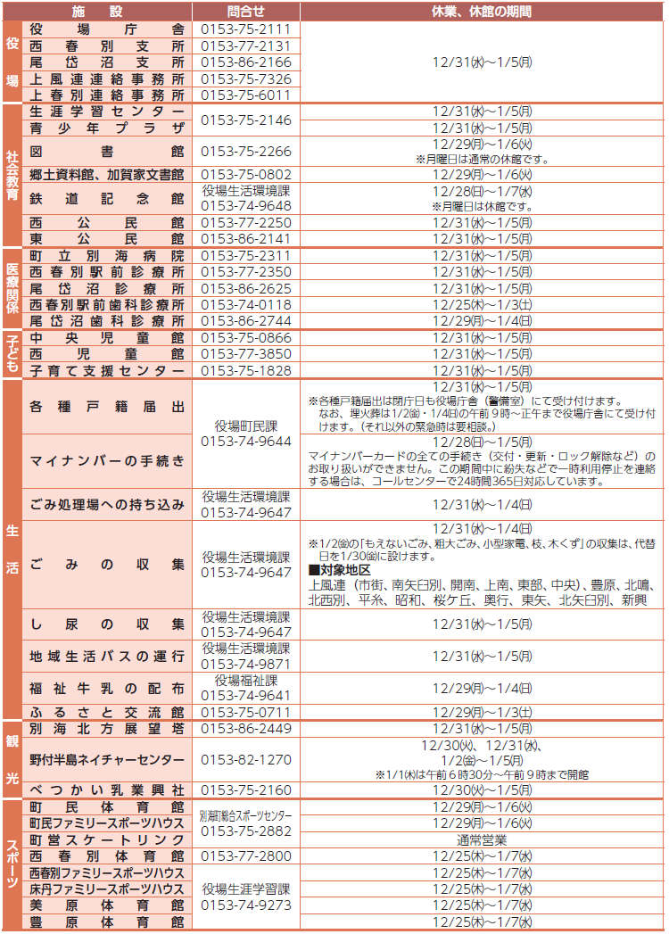 くらし 年末年始の町内各施設の予定表 5/54 前の記事 次の記事 発行日 : 2025年12月01日 自治体名 : 北海道別海町 広報紙名 : 広報別海 2025年12月号 Tweet シェアする まちのできごと 別海町ごみの減量化大作戦‼