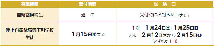 自衛隊では次のとおり、自衛官などを募集します。詳しくは下記までお問い合わせください