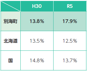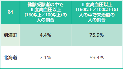別海町では、脳血管疾患で亡くなる方の割合が、国や北海道とは逆に増加傾向にあります(表1)。また、健診時の血圧がII度高血圧以上(160以上/100以上)なのに治療を受けていない方が75.9%と、北海道と比べて高い割合となっています(表2)。