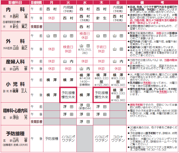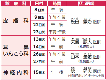 ※出張医による診療科は、天候、交通機関などの都合により休診や時間変更となる場合がありますので、あらかじめご了承ください。