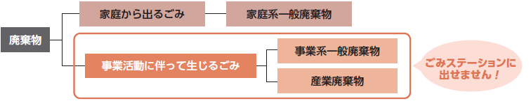 事業系ごみは、法律で、「排出者が自らの責任で適正に処理すること」と定められており、町では収集しないため、ごみステーションに出すことはできません。