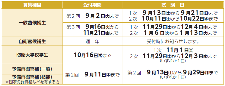 自衛隊では、次のとおり自衛官などを募集します。詳しくは、下記までお問い合わせください。