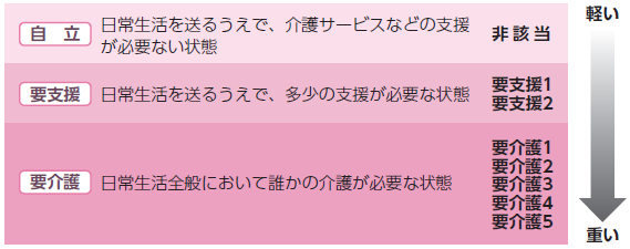 要介護認定は、要支援1・2から、要介護1から5までの7段階および非該当に分かれています。要介護度に応じて受けられるサービスが決まっています。
