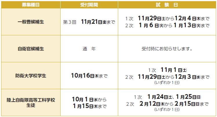 自衛隊では、次のとおり自衛官などを募集します。詳しくは、下記までお問い合わせください。