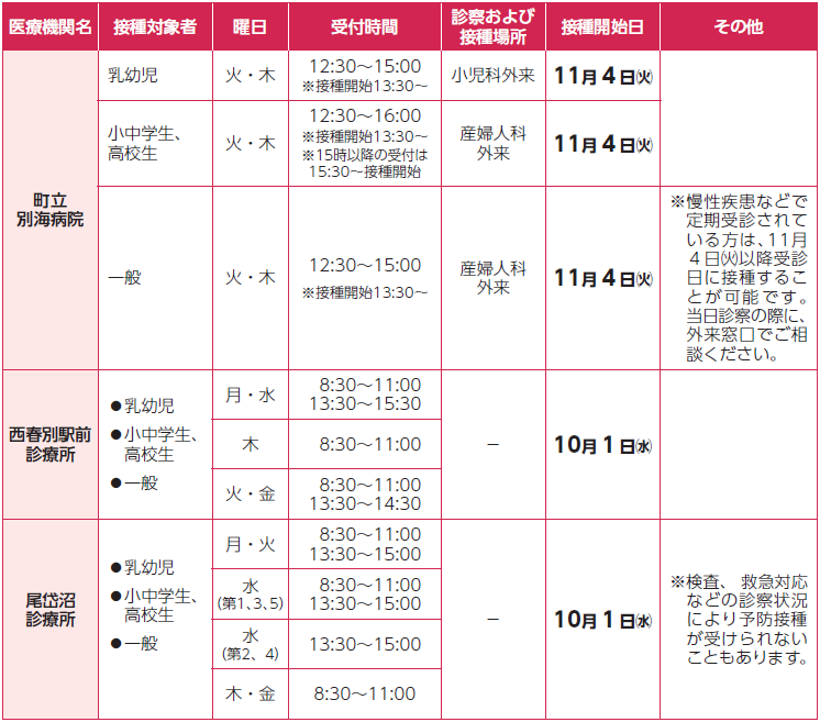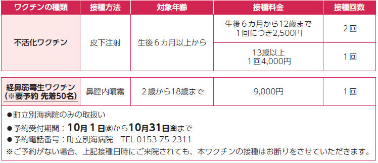 本町では、インフルエンザの発症、重症化を予防するために、ワクチン接種を行っています。町内の医療機関の接種日などは次のとおりですので、接種希望の方は接種開始日などを確認の上、お早めに接種をお願いします。