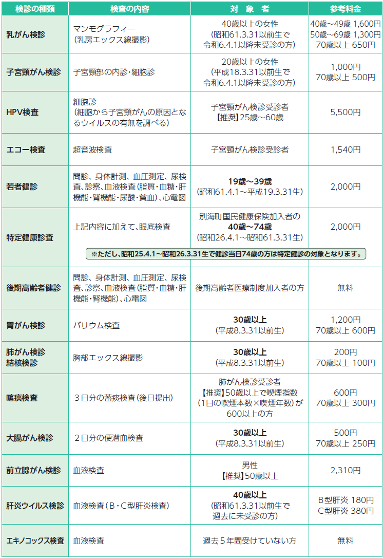 ◆別海町で実施する健診と料金