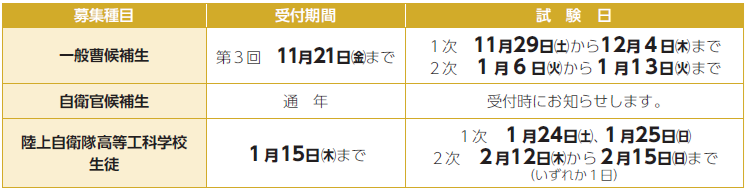 自衛隊では、次のとおり自衛官などを募集します。詳しくは、下記までお問い合わせください。
