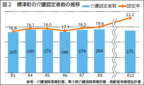 人口減少や高齢化が進む中で、介護認定者数は、ほぼ横ばいで推移する見込となっており、令和22年度には、介護認定者数が275人、認定率は22.2%と高齢者の約5人に1人が介護認定者となることが見込まれています。