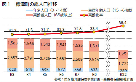 本町の人口は年々減少しており、令和22年度には、65歳以上が1,253人(高齢化率38.4%)に達すると予測されています。