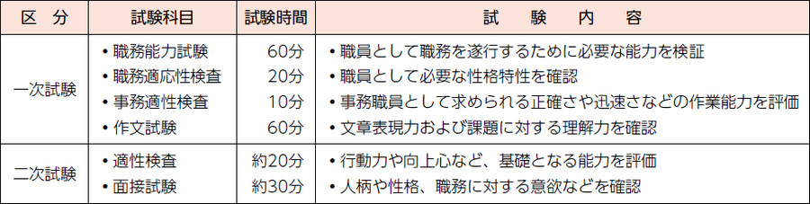 ※民間企業などからの志望者にも受験しやすい試験とするため、教養試験の代わりに職務能力試験および職務適応性検査を実施しています。問題集には事務適性検査を含め、(公財)日本人事試験研究センターが提供する問題集を使用します。