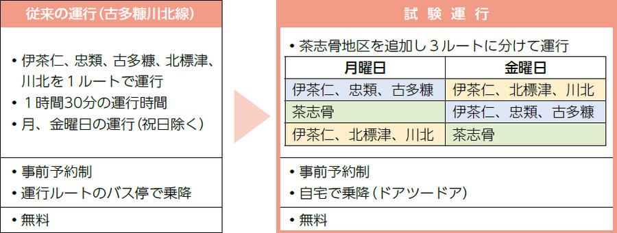 ・昨年7月より郡部地域から標津市街地への移動にご利用いただいている古多糠川北線の利便性向上のため、ご利用の対象地域と目的を拡大した試験運行を行っています。