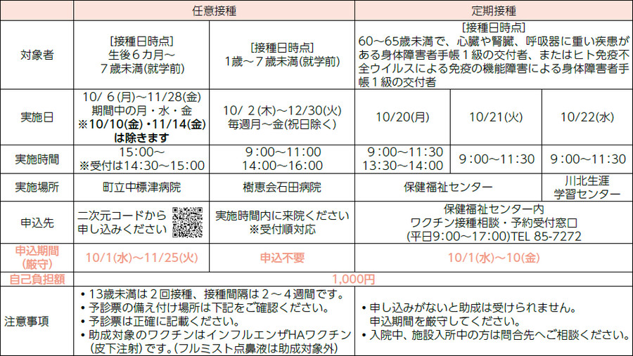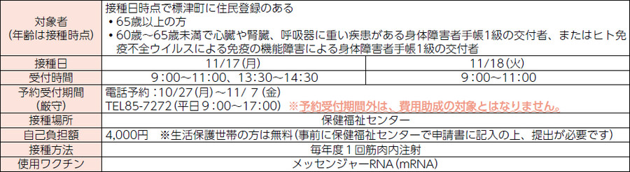 65歳以上の方(定期接種)、小中学生・標津高等学校生徒の方(任意接種)は、すでに案内を発送していますのでご確認ください。(案内が届いていない方は、問合先へご連絡ください)