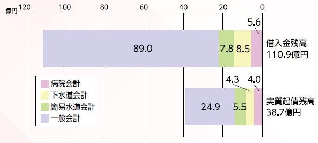 特定の収入で事業を行う下水道事業会計や病院会計などを含む全会計の借入金残高は110.9億円ですが、上記のように将来地方交付税などで補てんされる部分があることから、実質的な残高は38.7億円となります。