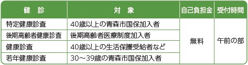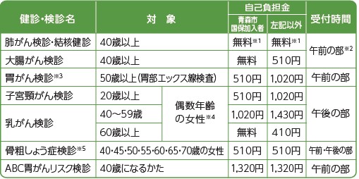 ★上記(※3含む)以外の検診・対象外のかたの検診については任意での検診となるため、費用は全額自己負担となります。申込みや料金などについては、医療機関または青森県総合健診センター(【電話】017‒741‒2336)へお問合せください。