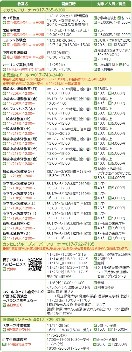 申込み:11/1(土)~30(日)に、応募フォームまたは申込書(元気プラザ・市民センターなどに備付け、市HP掲載)を、〒030‒0962 佃二丁目19‒13 健康づくり推進課(【E-mail】[email protected])へ