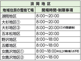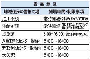雪捨て場内付近の混雑緩和や、雪捨て場内の安全確保のため、開場時間や搬入車両の制限がありますので、ご利用の際は、下表をご確認ください。なお、洋上風力発電の基地港湾整備に伴い、油川ふ頭の雪捨て場は令和8年度までの利用となります。