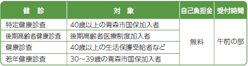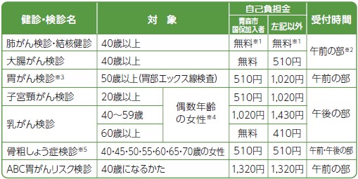 ★上記(※3含む)以外の検診・対象外のかたの検診については任意での検診となるため、費用は全額自己負担となります。申込みや料金などについては、医療機関または青森県総合健診センター(【電話】017‒741‒2336)へお問合せください。
