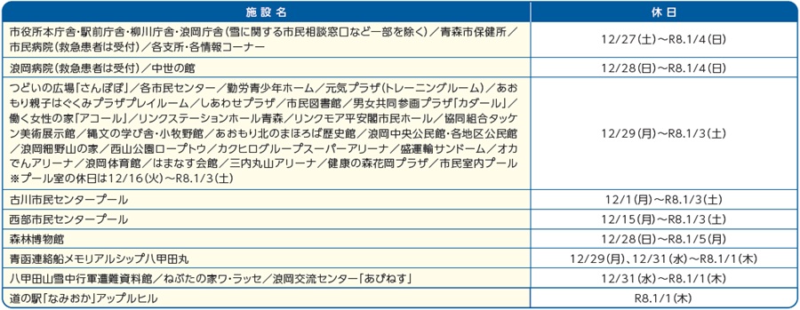 ・「道の駅」浅虫温泉ゆ~さ浅虫、リンクステーションヒルズ雲谷(スキー場/12/31(水)は16:00まで)は休まず営業します。