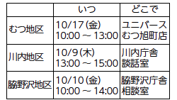 9月、10月の2ヶ月間は行政相談月間です。この月間中に、特設行政相談所を開設します。予約は不要ですので、お気軽にご相談ください。