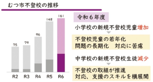 市における不登校児童生徒数は年々増加傾向にあり、令和6年度末の集計では161名に達しています。特に小学校において、新規の不登校児童が増加している状況です。一方、中学校では新規の不登校生徒数は抑制されているものの、依然として継続的な支援が求められています。今後も、児童生徒一人ひとりの状況に応じた不登校支援の充実と推進が必要です。