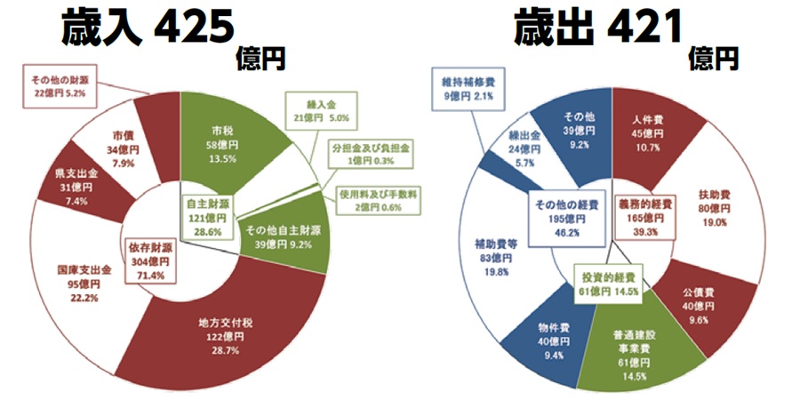 令和6年度については、令和5年度と比べ、物価高騰対策事業や新ごみ処理施設建設事業に要する経費が減少したことから、一般会計の歳入は、対前年度比2.4%減の425億2,765万円、歳出は対前年度比1.8%減の421億2,143万円となり、これから翌年度への繰越財源9,419万円を差し引いた実質収支額では、3億1,203万円の黒字を確保することができました。